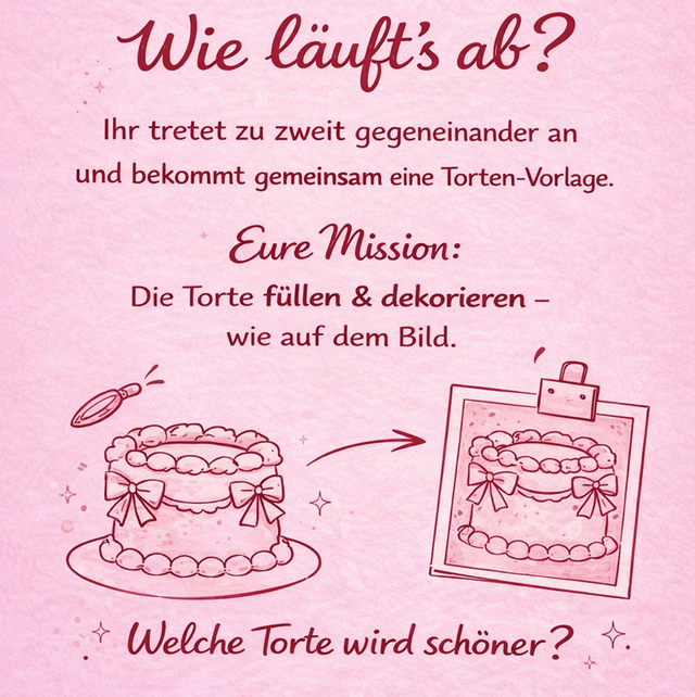Ihr tretet zu zweit gegeneinander an: Jedes Team erhält ein Bild. Eure Aufgabe? Die Torte füllen und anschließend möglichst nach Vorlage dekorieren. Wer hat das beste Auge fürs Detail? Wer entdeckt sein verborgenes Talent?